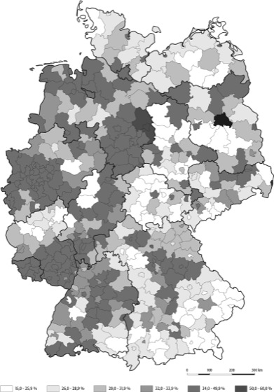 Auf der anderen Seite zeichnen sich ausgesuchte Regionen und Kreise im ehemaligen Westdeutschland durch sehr hohe Quoten aus. Im äußersten Nordwesten, im Emsland und in Ostfriesland, im Ruhrgebiet, im Saarland, in der Pfalz sowie im ehemaligen Zonenrandgebiet sind ebenfalls überdurchschnittlich hohe Quoten zu registrieren. Unterdurchschnittlich gering ist dagegen die Arbeitslosigkeit im Umland der großen Städte besonders im Süden ( Abb. 3).