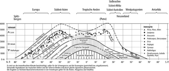 asymmetrischer Vegetationsaufbau der Erde, veranschaulicht die bekannte ungleiche Verteilung von Vegetationsformationen zwischen der nordhemisphärischen Landhalbkugel und der südhemisphärischen Wasserhalbkugel ( Abb. 1). Der Gegensatz ist flächenmäßig in den aus Wärmemangel waldfreien Tieflandsklimaten der circumpolaren arktischen nordhemisphärischen Hügelländer und den circumantarktischen australen Inseln am deutlichsten (Vegetationszonen). Weiteres Merkmal der Asymmetrie ist das Fehlen des borealen Nadelwaldes, der größtflächigen Vegetationsformation der Erde, auf der Wasserhalbkugel ( Abb. 2). Die Asymmetrie gilt aber auch zwischen der West- und Ostseite der nördlichen Landmasse: Unter Einfluss des kalten Labradorstroms reicht der boreale Nadelwald an der Ostküste Kanadas bis 46°N, während im Golfstromklima Südwestirlands (51°N) potenziell Lorbeerwald wachsen würde. Im schematischen Vegetationsprofil der immerfeuchten Vegetationstypen ( Abb. 2) ist die zweifelsohne asymmetrische Waldverteilung systematisch dadurch überzeichnet, dass in den nordhemisphärischen Gebirgen die obere Waldgrenze um 800-1300 m zu hoch und auf der Südhalbkugel um 500 bis 800 m zu tief eingetragen wurde. Die als "Ceja" (= Augenbraue des Waldes) in den tropischen Anden in 3500 m Meereshöhe eingetragene obere Waldgrenze ist durch menschgelegtes Feuer um 500-600 m erniedrigt. Die höchsten Vegetationsgrenzen der Erde sind nicht, wie aufgrund thermischer Gunst großer nordhemisphärischer Landmassen zu vermuten wäre, in 34°N (Tibet) zu finden, sondern in der südhemisphärisch-randtropischen bolivianischen Westkordillere (5000 m). Abweichend von der generellen Asymmetrie sind die Hartlaubformationen des subtropisch-wechselfeuchten Klimas mit Winterniederschlag symmetrisch an den Westseiten der Nord- und Südkontinente zu finden.