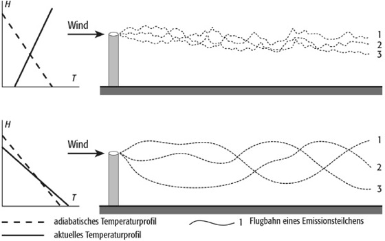 Während beim Gauß-Modell mit sehr engen Annahmen die Konzentration an einem Aufpunkt in Abhängigkeit von einem sehr grob klassierten Zustand der Atmosphäre bestimmt wird, wird bei Trajektorienmodellen der Weg eines Partikels oder Luftpaketes berechnet ( Abb.). Man bezeichnet sie als Lagrange-Modelle, weil die Berechnung auf den Lagrange'schen Bewegungsgleichungen beruht, einem System von Differenzialgleichungen, in denen die Koordinaten sämtlicher Massenpunkte als Funktion der Zeit bestimmt werden. Die Bewegungen können in einem orts- und zeitveränderlichen sog. Lagrange'schen Koordinatensystem beschrieben werden. Lagrange-Modelle basieren auf den Erhaltungssätzen von Masse, Energie und Impuls und berücksichtigen die statistische Turbulenz. Letzteres ist bedeutsam, um die Böigkeit der Luftbewegung, welche den mittleren Zustand überlagert, einzubeziehen. Diese ist eine Folge der Turbulenzbedingungen im Ausbreitungsfeld. Da die Trajektion eines Luftpaketes berechnet wird, also konkrete Bahnen ermittelt werden, sind darauf auch Modelle aufzubauen, bei welchen chemische oder physikalische Prozesse mit berücksichtigt werden, beispielsweise luftchemische Veränderungen in der Abluftfahne. Auch kann die Ausdünnung der Abluftfahne durch Senken in der Atmosphäre, etwa Rain-out oder Wash-out (Deposition), abgebildet werden.