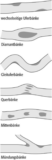 Bank, 1)Geologie: a) feste, von Schichtfugen begrenzte Gesteinsschicht oder b) kleinste unterscheidbare Einheit in der Lithostratigraphie (Stratigraphie). 2)Geomorphologie: Geschiebeablagerungen in einem Gerinnebett eines Fließgewässers, die bei Mittelwasser nicht überströmt werden. Sie erreichen nicht die Höhe des Auenniveaus und besitzen keinen dauerhaften Bewuchs; sie können vegetationslos, mit Gräsern, Büschen oder jüngeren Gehölzen bestanden sein. Es lassen sich ortsfeste von stromabwärts wandernden Bankarten trennen, deren Übergänge jedoch fließend ausgebildet sind. Bänke ebenso wie Inseln, beides Sohlenstrukturen der Gewässersohle, zeigen das Strukturbildungspotenzial bzw. die Eigendynamik eines Flusses an. Man unterscheidet ( Abb.) bei wandernden Bankformen Großdünen, Mittenbänke und wechselseitige Uferbänke, bei ortsstabilen Bankarten Diamantbank, Gleituferbank, Krümmungsbank, Mündungsbank und Querbänke. Bankbildung.