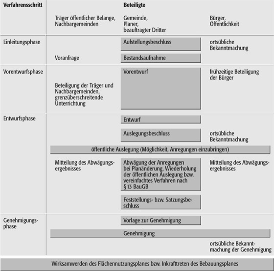 Bauleitplanung, als Pflichtaufgabe der Gemeinden unterste Ebene des Systems der Raumordnung der BRD. Sie besteht aus der vorbereitenden, die Bodennutzung auf Gesamtgemeindeebene in Grundzügen darstellenden Flächennutzungsplanung (Flächennutzungsplan) und der Bebauungsplanung (Bebauungsplan) als rechtsverbindlicher Bauleitplanung. Die juristische Grundlage bildet das Baurecht. Die Bauleitpläne sollen eine auf Nachhaltigkeit ausgerichtete städtebauliche Entwicklung und eine dem Wohl der Allgemeinheit entsprechende sozialgerechte Bodennutzung gewährleisten. Die Bauleitpläne benachbarter Gemeinden sind aufeinander abzustimmen. Die Bürger und Träger öffentlicher Belange sind möglichst frühzeitig über die allgemeinen Ziele, Alternativen und Auswirkungen der Planung zu unterrichten und umfassend an der Aufstellung zu beteiligen. Das Planaufstellungsverfahren ist daher ein mehrstufiger Prozess ( Abb.).