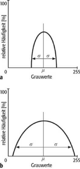 Bildverbesserung: Bildverbesserung: Grauwerteverteilung a) vor der Histogrammstreckung, niedriger Kontrast; b) nach der Histogrammstreckung, hoher Kontrast.