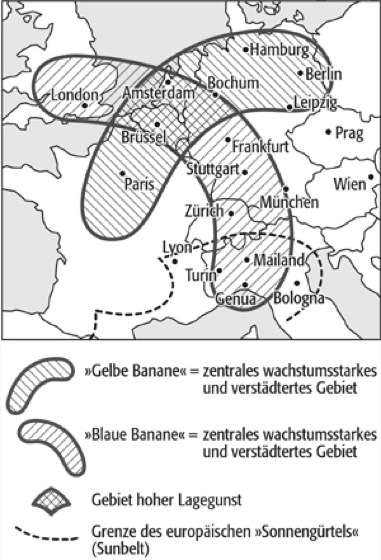 Blaue Banane, gekrümmtes Agglomerationsband vom Großraum London über die holländische Randstadt, den Ballungsraum Brüssel, das Rhein-Ruhrgebiet, den Raum Rhein-Main und Rhein-Neckar, über die östliche Schweiz bis hin zum norditalienischen Dreieck Turin-Mailand-Genua. Es ist ein Gebiet mit vergleichsweise dynamischer Wirtschaft und Wohlstand sowie starker Verkehrsverflechtung. Dieser Raum kann als blaugefärbtes Rückgrat der westeuropäischen Dynamik markiert werden (Blaue Banane). Quer dazu verläuft der südeuropäische Sonnengürtel an der Mittelmeerküste zwischen der nordöstlichen Adria bis hin zum mittelspanischen Küstensaum. Eine weitere quer dazu verlaufende europäische Entwicklungsachse lässt sich zwischen dem Großraum Paris über das Rhein-Ruhrgebiet, Hannover, Berlin weiter in Richtung Osten erwarten (Gelbe Banane). Abb.