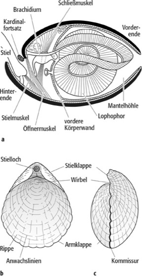Brachiopoden: Brachiopoden:Magellania flavescens: a) Grundbauplan; b) dorsale Schalenansicht; c) laterale Schalenansicht.