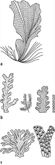 Bryozoen: Bryozoen: Moostierchen der Ordnung Cryptostomata: a) Fenestella, b) Acanthocladia, c) Tamniscus.