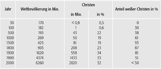 Die globale Ausbreitung des Christentums lässt sich auch an der zahlenmäßigen Entwicklung der christlichen Weltbevölkerung zeigen ( Abb.). Die Anteile der weißen Christen innerhalb des Christentums sind kennzeichnend für den Ausbreitungsprozess des Christentums.