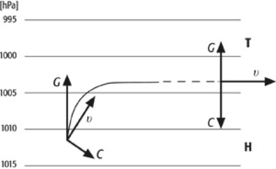 Corioliskraft: Corioliskraft: Ablenkende Wirkung der Corioliskraft auf einen Wind auf der Nordhalbkugel (G=Gradientkraft, C=Corioliskraft, υ=geostrophischer Wind, T=Tif, H=Hoch).