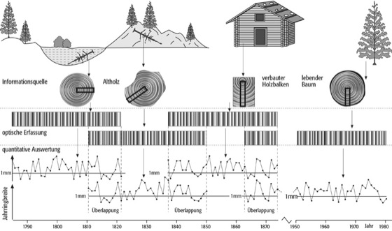 Aus der Dendrochronologie entwickelte sich die Dendroklimatologie, eine Methodik, wonach sich aus dem jahreszeitlich gebundenen Wachstumsverhalten bestimmter Bäume der dabei wirksame Klimaeinfluss rekonstruieren lässt ( Abb.). Dazu werden die für jedes Jahr typischen und optisch bestimmbaren Jahresringe verwendet. Die Zuordnung der Klimagrößen ist allerdings problematisch, da stets mehrere Einflüsse – auch nicht klimatologische – wirksam sind. Daher wird versucht, sich auf Zonen zu konzentrieren, in denen entweder die Temperatur oder der Niederschlag das begrenzende Klimaelement und somit der dominante Klimafaktor ist. Die Jahrringe der Bäume sind darüber hinaus auch Träger bestimmter Isotope bzw. radioaktiver Elemente, woraus sich ebenfalls Klimainformationen herleiten lassen. Die maximale Reichweite dendroklimatologischer Rekonstruktionen liegt derzeit bei rund 10.000 Jahren und umfasst somit das gesamte Holozän. Proxidata.