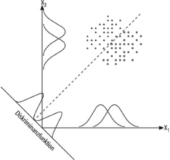 Ausgehend von den m Variablen Xj werden neue Dimensionen Yl, die sog. Diskriminanzfunktionen, berechnet, bezüglich denen die Trennung der Gruppierung optimal beobachtet werden kann ( Abb.). Diese Diskriminanzfunktionen sind paarweise unkorreliert. Als Strukturkoeffizienten bezeichnet man die Korrelationen zwischen den Diskriminanzfunktionen Yl und den Ausgangsvariablen Xj. In der Regel werden in der Geographie lineare Diskriminanzanalysen durchgeführt, wenn auch grundsätzlich nichtlineare Ansätze möglich sind. Berechnung und Interpretation gestalten sich jedoch als weitaus schwieriger.