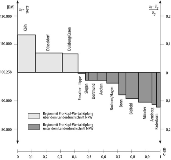Disparitätendiagramm: Disparitätendiagramm: Disparitätendiagramm der Bruttowertschöpfung der Raumordnungsregionen in NRW 1996. G=Erwerbstätige im Gesamtraum, gi=Erwerbstätige in der Teilregion i, yi=Bruttowertschöpfung zu Faktorkosten in der Region i, xi Bruttowertschöpfung zu Faktorkosten pro Erwerbstätigen in der Region i, xg=Bruttowertschöpfung zu Faktorkosten pro Erwerbstätigen im Gesamtraum.
