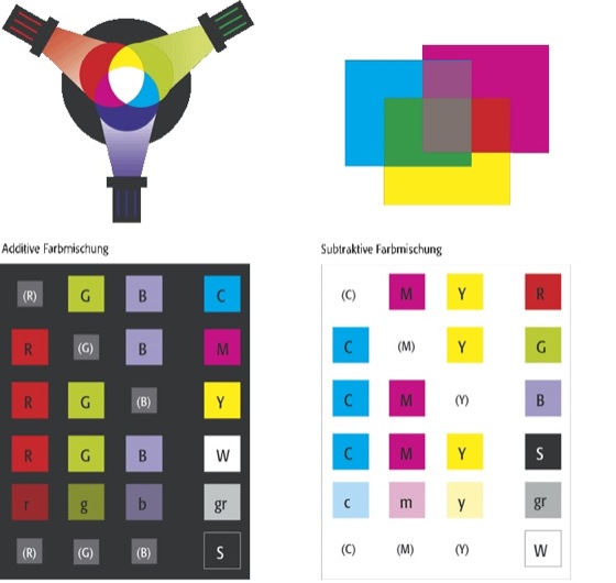 Farbmischung: Farbmischung: Additive und subtraktive Farbmischung der Grundfarben (R=Rot, G=Grün, B=Blau, C=Cyan, M=Magenta, Y=Yellow, W=Weiß, gr=Grau, S=Schwarz).