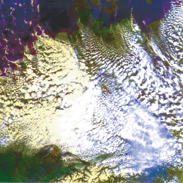 Fernerkundung 1: Wolkenverteilung in einem AVHRR-Bild aus dem sichtbaren und infraroten Spektralbereich (hellblau: dünne Eiswolken (Cirren); weiß: Quellwolken; gelb: tiefere Wolken; grün: wolkenfreies Land) (NOAA-14 12.4.1997, 13:01 UTC).