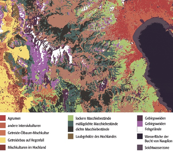 Fernerkundung 4: Landnutzung auf den Peloponnes, Griechenland, ermittelt durch eine multitemporale Bildklassifikation. Der Merkmalsraum pro Bildpunkt besteht aus den Daten der oben abgebildeten punktgenau überlagerten Landsat TM-Szenen.