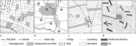 Flurform: Flurform: Verschiedene Flurformen: Kleinblockgemengeflur (a), Kleinblockeinödflur (b), Längstreifengemengeflur (c) und Gewannflur (d).