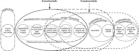 Trotz der spezifischen Bedeutung der jeweiligen Teilbereiche wird in der Regel von der komplex angelegten Freizeit- und Tourismusgeographie ausgegangen. Ein Grund hierfür ist, dass sich sowohl der Urlaubsreise- als auch der Naherholungsverkehr aus der übergeordneten Kategorie Freizeit ableiten lassen ( Abb. 1 und 2 ). Selbst der ursächlich nicht daraus resultierende Geschäfts- und Kurreiseverkehr beinhaltet eine immer stärker ausgeprägte Freizeitkomponente (z.B. in Form von Nachkongressen, Kur-Urlauben).