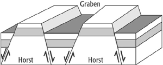 Graben: Graben: Schematische Darstellung von Horst- und Grabenbildungen. Die Pfeile zeigen die relative Bewegungen der Schollen an.