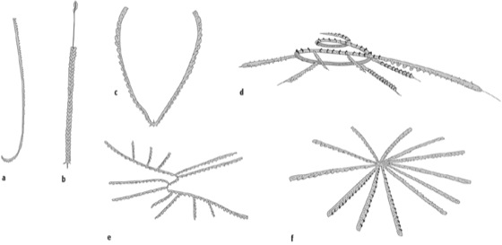 Graptolithen: Graptolithen: Verschiedene Formen von Graptolithen: a) Monograptus, b) biserialer Graptolith, c) Decellograptus, d) Cyrtograptus, e) Nemagraptus, f) Loganograptus.