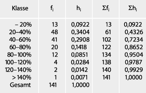 Häufigkeitsverteilung, Bezeichnung der Gesamtcharakteristik der statistischen Eigenschaften einer oder mehrerer simultan betrachteter endlicher Datenreihen (Variablen). Eine solche Verteilung wird in einer Tabelle, die die Anzahl der Werte einer Variablen innerhalb einzelner Werteklassen auflistet, erfasst ( Abb. 1). Es wird dabei unterschieden zwischen absoluten Häufigkeiten fi, relativen Häufigkeiten hi und den absoluten bzw. relativen Summenhäufigkeiten. Ziel bei der Erstellung einer Häufigkeitsverteilung ist es, eine möglichst gute Übersichtlichkeit über die "Verteilung" der Werte bei möglichst geringem Informationsverlust zu erreichen. Die Häufigkeitsverteilung kann graphisch verschieden dargestellt werden ( Abb. 2). Einige in der Geographie häufiger vorkommende Verteilungsformen sind in Abbildung 3 aufgeführt.