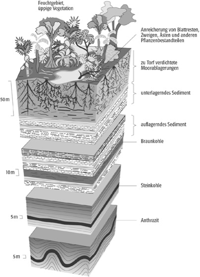 Inkohlung: Inkohlung: Mächtigkeitsverhältnisse bei der Entwicklung vom Torf bis zum Anthrazit. Von oben nach unten nimmt der Kohlenstoffgehalt zu, die flüchtigen Bestandteile hingegen ab.
