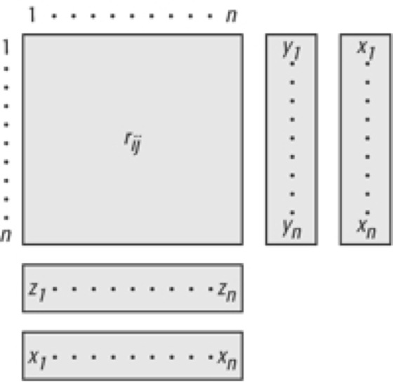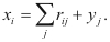 Zum anderen lässt sich – in spaltenweiser Betrachtung der Tabelle – xj berechnen aus dem Primärinput zj, der Löhne, Gewinne und Importe umfasst, und den Vorleistungen rij, die j für alle übrigen Sektoren i erbringt: ![]()