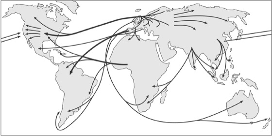In Abbildung 3 sind mehrere relativ abgeschlossene räumliche Systeme internationaler Wanderungen zu erkennen. In Europa wurden die Gastarbeiterwanderungen aus den Mittelmeerländern in Richtung Norden vom Zustrom aus der Dritten Welt und, nach dem Zusammenbruch des Warschauer Paktes, aus Ost- und Südosteuropa abgelöst (z.B. Aussiedler in Deutschland). Heute sind Italien und Spanien Einwanderungsländer. Die Zuzüge in die USA stammen vor allem aus der Karibik, Zentralamerika sowie Ostasien, die Golfregion erhält Migranten aus dem Vorderen Orient sowie dem asiatischen Raum.