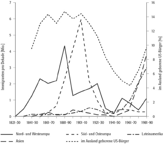 internationale Wanderung 2: internationale Wanderung 2: Herkunftsgebiete der Migranten in die USA (1821-1990).