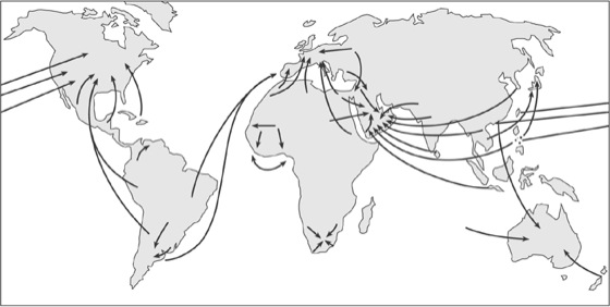 internationale Wanderung, internationale Migration, Außenwanderung, alter und neuer Wohnstandort gehören zu verschiedenen Staatsgebieten. Dieser Typ von Migration verzeichnete seit dem 16. Jh. eine deutliche Zunahme (Mobilitätstransformation). Die wichtigsten Ströme waren die europäischen Überseewanderungen nach Nord- und Südamerika (Einwanderungsländer), die erzwungenen Sklavenwanderungen (Sklavenhandel) aus Afrika in die Neue Welt sowie die Arbeitskräftewanderungen (Arbeitsmigration) von Chinesen und Indern ( Abb.1). Das Beispiel USA belegt die großen Schwankungen bei den Immigrationen sowie die sich ändernde Zusammensetzung der Zuzüge nach Auswanderungsländern ( Abb. 2).