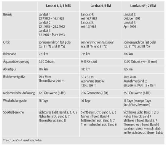 Landsat: Landsat: Technische Daten der Landsat MSS-, TM- und ETM-Sensoren.