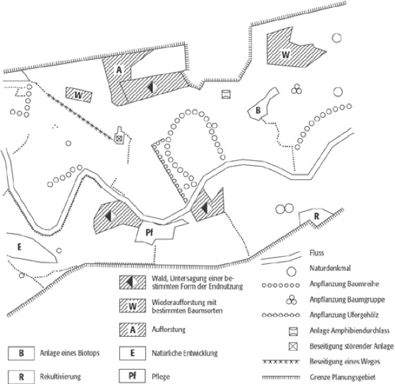 Landschaftsplan, nach dem Bundesnaturschutzgesetz auf örtlicher Ebene (Landschaftsplanung) vorgesehener Plan zur Verwirklichung der Ziele von Naturschutz und Landschaftspflege. Der Landschaftsplan gliedert sich normalerweise in Text-, Karten- ( Abb.) und Begründungsteil und enthält Darstellungen zum gegenwärtigen sowie zum angestrebten Zustand von Natur und Landschaft. Hierfür sind Schutz-, Pflege- und Entwicklungsmaßnahmen anzugeben. Bei der Aufstellung des Landschaftsplanes sind die Ziele der Raumordnung zu beachten und die Grundsätze und sonstigen Erfordernisse der Raumordnung zu berücksichtigen. Die Bundesländer regeln die Verbindlichkeit der Landschaftspläne, insbesondere für die Bauleitplanung. Sie können bestimmen, dass Darstellungen und Festsetzungen der Landschaftspläne in die Bauleitpläne aufgenommen werden.