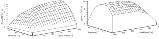 limitierende Faktoren: limitierende Faktoren:Nettophotosynthese von Corylus avellana (Haselnuss) bei großer stomatärer Leitfähigkeit als Funktion der limitierenden Faktoren Licht und Temperatur.