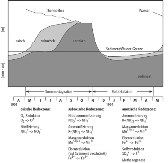 limnische Ökosysteme 1: limnische Ökosysteme 1: Saisonale Redoxdynamik des Belauer Sees (Schleswig-Holstein) mit Angabe der wichtigsten Reaktionen.