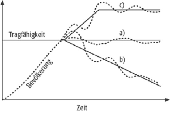 Die Abbildung stellt mögliche Auswirkungen auf die Bevölkerungszahl dar, wenn sie die Tragfähigkeit eines Raumes übertrifft. Im Fall a) erfolgt durch einen Wechsel von "positiv" und "preventive checks" eine wellenförmige Angleichung der Einwohnerzahl an die konstant bleibende Tragfähigkeit. Im Fall b) hält das Bevölkerungswachstum an, die Lebensgrundlagen werden zerstört und damit die Tragfähigkeit erniedrigt, dies führt zu sinkenden Einwohnerzahlen. Im Fall c) führt der Bevölkerungsdruck zu Innovationen (z.B. bei der Nahrungsmittelrevolution, heute die Einführung künstlicher Düngung, ertragreicher Nutzpflanzen oder eines erhöhten Maschineneinsatzes in der Landwirtschaft), sodass die Tragfähigkeit ansteigt und sich das Bevölkerungswachstum fortsetzen kann, bis sich die Einwohnerzahl dem neuen Niveau annähert. Neuerungen in der Verkehrstechnologie erlauben über den Import von Nahrungsmitteln ebenfalls eine Steigerung der Tragfähigkeit. Da Malthus von einer invarianten Tragfähigkeitsgrenze ausgegangen ist, schließt sein Bevölkerungsgesetz nur den Fall a) und b) ein.