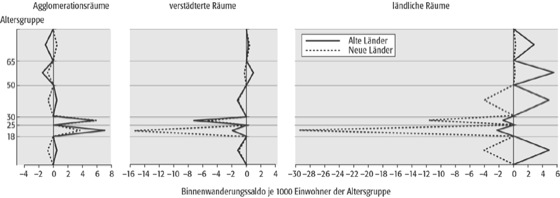 Migrationsbäume, charakterisieren Wanderungsströme oder Wanderungssalden nach der Altersstruktur. Interregionale Wanderungen weisen in Deutschland eine ausgesprochene Wanderungsselektion in Abhängigkeit von der Siedlungsstruktur auf ( Abb.). Die markantesten Unterschiede ergeben sich bei den 18- bis unter 30-Jährigen, die Wanderungsgewinne in den Agglomerationen und z.T. erhebliche Verluste, insbesondere in Ostdeutschland, in den verstädterten und ländlich geprägten Räumen verzeichnen. Die Ursachen liegen hauptsächlich in Infrastruktur- sowie Arbeitsplatzdefiziten. Insgesamt belegen die Migrationsbäume für die alten Bundesländer eine interregionale Dekonzentration zugunsten weniger verdichteter Räume, die von Familien (Familienwanderung) und älteren Menschen getragen wird (Altenwanderung), während in den neuen Bundesländern eher ein Konzentrationsprozess überwiegt, der durch die Ost-West-Wanderungen überlagert wird.
