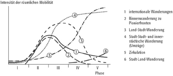 Mobilitätstransformation, Mobilitätsübergang, mobility transition, postuliert einen regelhaften Verlauf von Formen und Ausmaß der räumlichen Mobilität und verknüpft diesen dynamischen Ansatz mit dem sozialen Wandel. Unter sozialem Wandel wird insbesondere die Modernisierung einer Gesellschaft im Zuge der Industrialisierung verstanden, die auch den demographischen Übergang beeinflusst hat. Die räumliche Mobilität wird in folgende Typen eingeteilt: internationale Wanderungen, Binnenwanderungen zu Pionierfronten (mit der Erschließung neuer Siedlungsgebiete oder mit Meliorisationsvorhaben), Land-Stadt-Wanderungen, Stadt-Stadt- und innerstädtische Wanderungen, Zirkulationen. Neuerdings werden noch Stadt-Land-Wanderungen ergänzt. Die Abbildung setzt die räumliche Mobilität in Beziehung zu fünf Stufen der gesellschaftlichen Entwicklung: Eine insgesamt geringe Mobilität prägt Stufe I, die präindustrielle Gesellschaft (premodern industrial society), mit hohen Geburten- und Sterberaten und relativ stabiler Bevölkerungszahl. Räumliche Bewegungen sind vor allem auf die nähere Umgebung ausgerichtet und dienen der Nahrungsmittelversorgung, dem Handel sowie dem Aufsuchen religiöser Stätten. In der frühen Transformationsphase, Stufe II (early transitional society), öffnet sich die Bevölkerungsschere und steigender Bevölkerungsdruck motiviert die Einwohner zur Erschließung neuer Siedlungsgebiete und der Urbarmachung bisher nicht landwirtschaftlich genutzter Räume. Hierzu zählen die europäischen Übergangswanderungen z.B. nach Nord- und Südamerika. In der späten Transformationsphase, Stufe III (late transitional society), schließt sich die Bevölkerungsschere wieder. Das natürliche Wachstum klingt ab und auch Binnenwanderungen zu Pionierfronten gehen in dieser Stufe stark zurück. Der sozioökonomische Strukturwandel im Zuge der Industrialisierung erhöht den Umfang der Land-Stadt-Wanderungen und aufgrund der dadurch hervorgerufenen Bevölkerungsumverteilung zugunsten städtischer Räume gewinnen Migrationen zwischen und innerhalb von Städten sowie zirkuläre Bewegungen an Bedeutung. In der modernen Gesellschaft, Stufe IV (advanced society), dominieren Stadt-Stadt- und innerstädtische Wanderungen sowie verschiedene Formen der Zirkulation. Die sich verringernde Wochenarbeitszeit sowie die zunehmende Zahl von Urlaubstagen erhöht den Umfang freizeitorientierter Bewegungen, und der Ausbau der Verkehrsinfrastruktur ermöglicht größere Pendlereinzugsgebiete der Kernstädte. Zugleich verstärken sich die Zuwanderungen von gering qualifizierten Arbeitskräften aus den Entwicklungsländern in die Agglomerationen der Industriestaaten, die auch in wachsendem Umfang Ziel von gut ausgebildeten Personen werden. In einer zukünftigen postindustriellen Gesellschaft, Stufe V (future super-advanced society), ermöglichen Fortschritte in der Informations- und Kommunikationstechnologie zwar einen Rückgang der Zirkulation, dem stehen aber weiter verbesserte Verkehrsinfrastruktur und -mittel und damit Pendlerbewegungen über größere Distanzen entgegen.