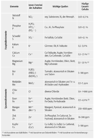 Nährelemente, die lebenswichtigen, von der Pflanze in Ionenform aufgenommenen Elemente, welche in größerer Menge benötigt werden (Hauptnährelemente)oder in geringeren Mengen (Spurenelementen) ( Abb.).