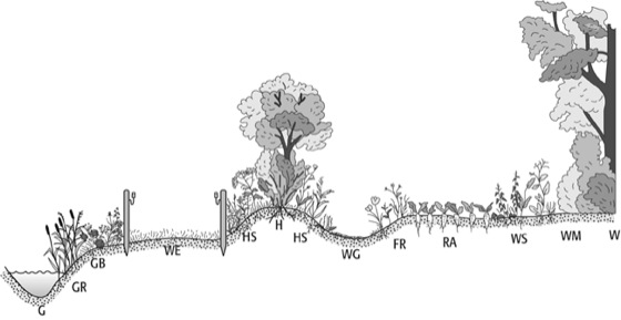 Ökoton Ökoton: Schnitt durch eine Landschaft mit Ökotonen: Grabenböschung (GB), Hecke (H) und Heckensäume (HS), Feldrain (FR), Waldmantel (WM) und Waldsaum (WS). Biotope ohne Ökotonfunktion sind der wasserführende Graben (G), das Grabenröhricht (GR), die Weide (WE), der unbefestigte Feldweg (WG), der Rübenacker (RA) und der Wald (W).