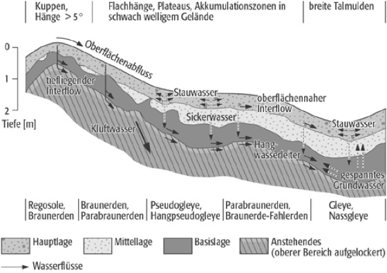 periglaziäre Lagen 2: periglaziäre Lagen 2: Schematische Darstellung des Einflusses periglaziärer Lagen auf die Abflussprozesse im Boden.