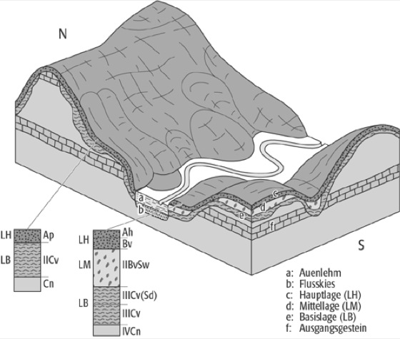 periglaziäre Lagen 3: periglaziäre Lagen 3: Modell des Aufbaus und der Verbreitung periglaziärer Lagen in Mittelgebirgslandschaften in Abhängigkeit von der Reliefposition.