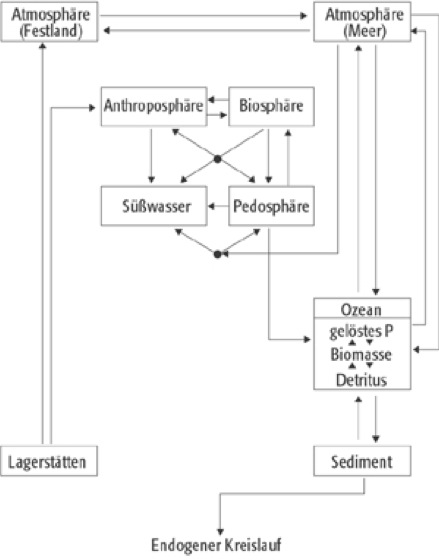Phosphorkreislauf, unterscheidet sich von den Flüssen der anderen Makroelemente C, H, O, N und S wesentlich dadurch, dass dem Luftpfad im globalen Rahmen nur sehr geringe Bedeutung zukommt. Obwohl mit 0,12 Gew.-% das 11. häufigste Element der Erdkruste, verweist schon das sog. Redfield-Verhältnis – es besagt, dass in lebender Substanz im Mittel auf 106 C-Atome 16 N- und 1 P-Atome entfallen – auf die vielfach produktionsbegrenzende Rolle des Phosphors. In Böden, Sedimenten und Gesteinen liegt er in über 200 unterschiedlichen anorganischen Verbindungen vor; in Form des Orthophosphats (PO 43-) ist er in mehr als 70 Mineralien meist an Ca, Fe, Al und Silicate gebunden. Im Tier- und Pflanzenreich findet sich Phosphor in anorganischen und vor allem organischen Bindungsformen wie Aminosäuren, Proteinen, Enzymen und Nukleinsäuren; Adenosintriphosphat (ATP) nimmt im Energiehaushalt der Zelle eine zentrale Stellung ein. Die Verfügbarkeit des Phosphors kann für Pflanzen sowohl in terrestrischen wie aquatischen Ökosystemen stark eingeschränkt sein. Abgesehen von tropischen Ferralsols sind anhaltende P-Mangelzustände jedoch weitgehend auf Binnengewässer beschränkt, wie das Redfield-Verhältnis eines typischen, unbelasteten kalkreichen Sees zeigt (106 C:28 N:0,0015 P). Hier bestimmt in der Regel die Nachlieferung von Phosphor aus dem Einzugsgebiet, zusammen mit dem P-Austausch zwischen Sediment und Wasserkörper, unmittelbar die Intensität der Primärproduktion (limnische Ökosysteme). Eine P-Überversorung hat allerdings, anders als in terrestrischen Ökosystemen oder beim Menschen, erhebliche negative Auswirkungen. Am bekanntesten sind Massenentwicklungen von Algen, die nach dem Absterben und Absinken zu intensiven sauerstoffzehrenden Abbauprozessen in tieferen Wasserschichten führen, die dann als Lebensraum für die meisten Tierarten ausscheiden. Zudem kommt es unter reduzierenden Bedingungen zur Bildung von Methan, Ammonium und Schwefelwasserstoff, die in höheren Konzentrationen toxisch wirken. In globaler Betrachtung ergibt sich das in der Abbildung 1 wiedergegebene Bild der Phosphorverteilung in Erdkruste, Pedo-, Bio- und Hydrosphäre und der resultierenden Flüsse; genauere quantitative Kennzeichnungen enthält die Abbildung 2 .