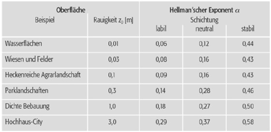 Potenzgesetz: Potenzgesetz: Richtwerte des Hellmann'schen Exponenten α für Oberflächen mit unterschiedlicher Rauigkeit z 0 bei labilen, neutralen und stabilen Schichtungsverhältnisse.