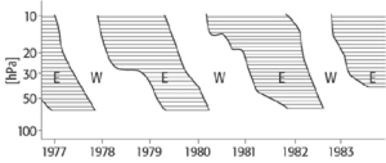 QBO: QBO: Windverhältnisse der tropischen Stratosphäre zwischen 100 und 10 hPa (schraffiert=Ostwinde (E) und nicht schraffiert=Westwinde (W)).