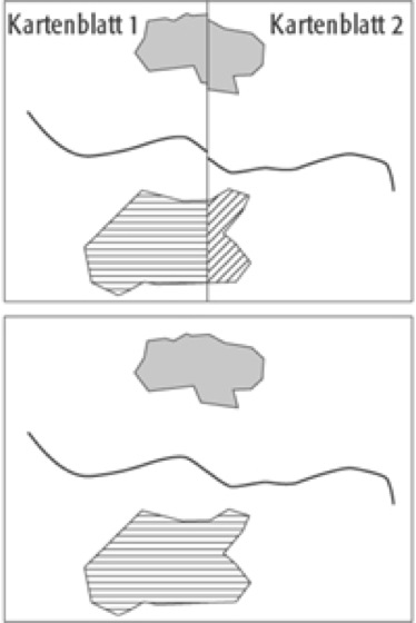 Randanpassung, edge matching, automatisierte bzw. halbautomatisierte Verfahren zur Zusammenführung blattschnittsweise vorliegender digitaler geographischer Daten; beinhaltet z.B. die Zusammenfassung von durch einen Kartenrand getrennten Flächen oder Linien und ihrer Attribute ( Abb ).