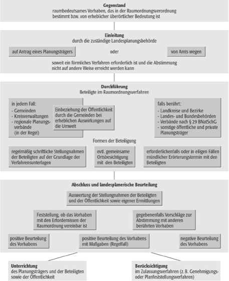 Raumordnungsverfahren, ROV, förmliche Prüfung eines überörtlich raumbedeutsamen Vorhabens nach §15 Raumordnungsgesetz bzw. dem jeweiligen Landesplanungsgesetz, um dessen Übereinstimmung mit den Zielen und Grundsätzen der Raumordnung und Landesplanung festzustellen und um zu prüfen, wie verschiedene Vorhaben unter den Gesichtspunkten der Raumordnung aufeinander abgestimmt oder durchgeführt werden können ( Abb. ). Diese sog. Raumverträglichkeitsprüfung hat planungssichernde Funktion. Das Ergebnis des ROV entfaltet gegenüber dem Träger des Vorhabens aber keine unmittelbare Rechtswirkung. Es ist ein vorgelagertes Verfahren, z.B. vor Durchführung eines Planfeststellungsverfahrens, das der verwaltungsinternen Abklärung der raumordnerischen Verträglichkeit und insbesondere der Beurteilung von Trassen- bzw. Standortalternativen dient. Die Raumordnungsverordnung gibt die Hauptanwendungsfälle des ROV an: Errichtung von Deponien und Kraftwerken, Gewässerumgestaltungen, der Bau von Bundesfernstraßen, die Errichtung von Feriendörfern, Hotelkomplexen und Freizeitanlagen sowie die Errichtung von Einkaufszentren und großflächigen Einzelhandelsbetrieben.