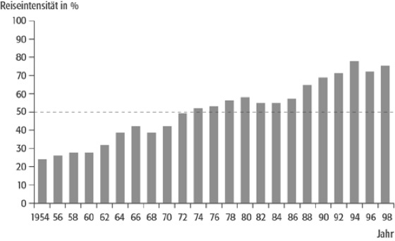 Reiseintensität: Reiseintensität: Bevölkerungsanteil, der den Urlaub zum Reisen nutzt (1954-1998).
