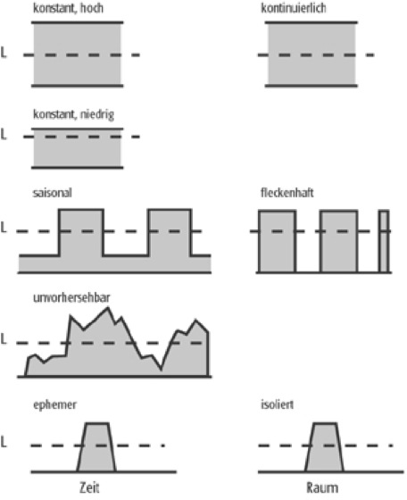 Ressource, 1)Allgemein: Hilfsmittel, Reserve, Geldmittel. 2)Sozialgeographie: allokative Ressourcen und autoritative Ressourcen. 3)Zoogeographie: biotische (Nahrung, Wirt, Fortpflanzungspartner) oder abiotische Lebensgrundlage (Raum, Licht, Wasser, Untergrund) für einen Organismus. Die Gesamtheit der benötigten Ressourcen bestimmt die Nische einer Art. Die begrenzte Verfügbarkeit einer oder mehrerer Ressourcen ist die Grundlage für Konkurrenz. Die Verfügbarkeit von Ressourcen in der Zeit und im Raum lässt sich in Kategorien wie konstant, saisonal, unvorhersehbar, kurzfristig verfügbar bzw. fleckenhaft, isoliert und kontinuierlich einteilen ( Abb. ), die aber erst durch Skalierung mit der Generationszeit und Futtersuchezeit der betrachteten Art relevant werden.