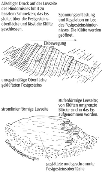 Rundhöcker, Roches moutonnées, vom Gletscher zu stromlinienförmigen Körpern umgestaltete Felsbuckel. An der Luvseite eines Felshindernisses führt der Gletscherdruck zur Schmelze und Ausbildung eines Gleitfilms. Hier erzeugt die Abrasion eine glatte, stromlinienförmige Oberfläche. Auf der Leeseite friert bei nachlassendem Druck das Gestein an der Gletscherbasis fest, wodurch einzelne Blöcke an Kluftflächen abgerissen werden ( Abb. ).