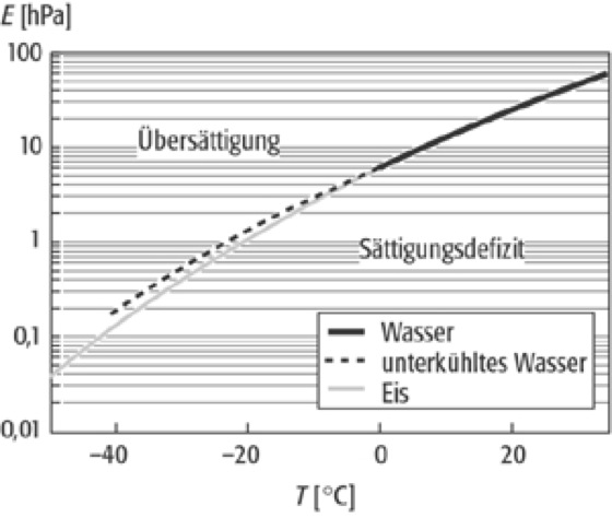 mit T=Lufttemperatur [°C], a=7,5, b=235 (über Wasser > 0°C); a=7,6, b=240,7 (über unterkühltem Wasser); a=9,5, b=265,5 (über Eis). E über Eis ist bei gleicher Temperatur kleiner als über unterkühlten Wasserflächen ( Abb. ). Übersteigt der aktuelle Dampfdruck den Sättigungsdampfdruck, liegt Übersättigung vor und Bildung von Flüssigwasser durch Kondensation bzw. Eis durch Deposition kann einsetzen. Die Temperaturen, bei denen die jeweiligen Prozesse beginnen, heißen Kondensationspunkt (Kondensation) bzw. Gefrierpunkt. Gegenüber ebenen Flächen erhöht sich der Sättigungsdampfdruck über gekrümmten Oberflächen teilweise erheblich, sodass beispielsweise große Wolkentröpfchen auf Kosten kleinerer anzuwachsen vermögen (Krümmungseffekt). Liegt der aktuelle Dampfdruck unter dem Sättigungsdampfdruck, kann die Luft noch Wasserdampf durch Verdunstung oder Sublimation aufnehmen; es besteht somit ein Sättigungsdefizit. Man unterscheidet das absolute Sättigungsdefizit [hPa] vom relativen Sättigungsdefizit [%] (100% – relative Feuchte (Luftfeuchte)).