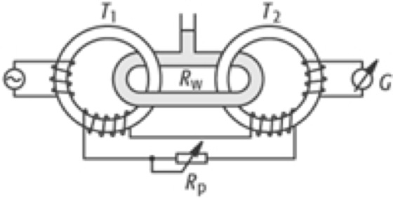 Salzgehalt: Salzgehalt: Prinzip der induktiven Leitfähigkeitsmessung. T 1+T 2=Transformatoren, R W=Widerstand, R P=Potenziometer, G=Galvanometer.