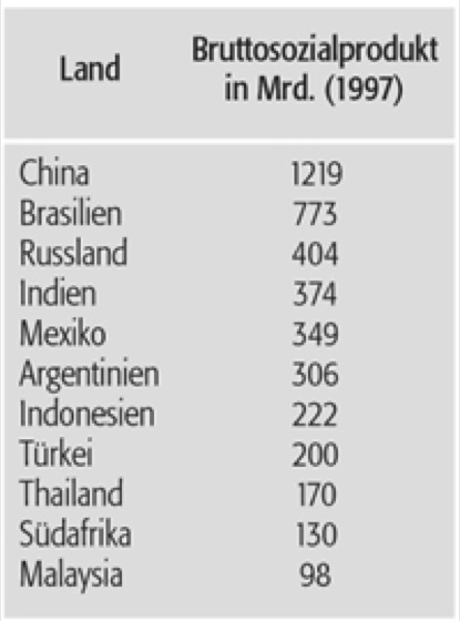 Schwellenländer, Entwicklungsländer auf der Schwelle zum Industrieland. Der Begriff kennzeichnet die Gruppe von ehemaligen Entwicklungsländern, die seit den 1960er-Jahren den Prozess der industriellen Entwicklung erfolgreich durchlaufen haben. Die am häufigsten angewendeten Kriterien zur Messung des Industrialisierungsgrades sind das Bruttoinlandsprodukt, das Bruttosozialprodukt, das Pro-Kopf-Einkommen und Grad der Industrialisierung. Diese Indikatoren sagen jedoch wenig über die Lebensverhältnisse der jeweiligen Bevölkerungen aus. In der Tat ging und geht wirtschaftliches Wachstum immer mit einer breitenwirksamen Verbesserung der Lebenssituation der Menschen in jenen Ländern einher. Somit ziehen viele Institutionen auch soziale Messkriterien wie z.B. die Quote der Alphabetisierung, die Einschulungsrate und/oder die Lebenserwartung hinzu. Je nach verwendeten Abgrenzungskriterien variiert die Zahl der als Schwellenländer bezeichneten Länder zwischen 10 und mehr als 40. Die Weltbank bezeichnet als Schwellenländer jene Länder mit einem Bruttosozialprodukt über 100 Mrd. US-Dollar ( Abb. ). Fünf der Schwellenländer der "ersten Generation" haben in den 1990er-Jahren die Schwelle zu den Industrieländern überschritten und werden als Neue Industrieländer (Newly Industrialising Countries) bezeichnet. Dies sind die ostasiatischen sog. Tigerstaaten (Hongkong, Süd-Korea, Singapur und Taiwan) sowie Israel. Die bedeutendsten lateinamerikanischen Schwellenländer Argentinien, Mexiko und Brasilien verloren hingegen in den 1980er-Jahren aufgrund der Verschuldungskrise an Dynamik. Diese Differenzierung der Schwellenländer der ersten Generation ging einher mit dem wirtschaftlichen Aufschwung einiger weiterer asiatischer Länder: Malaysia, Thailand, Indonesien sowie rezent Vietnam und China. Sie werden oft als die Schwellenländer der zweiten Generation bezeichnet. Die Schwellenländer-Entwicklung ist von hoher weltwirtschaftlicher und -politischer Bedeutung. Für die Industrieländer sind sie interessante Handelspartner und -konkurrenten zugleich. Sie bestimmen zunehmend das weltpolitische Geschehen, haben bedeutenden Anteil an den sozialen und ökologischen Weltproblemen und entwicklungspolitische Effekte für andere Entwicklungsländer.