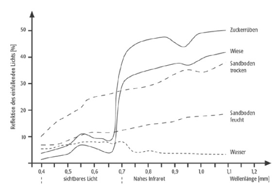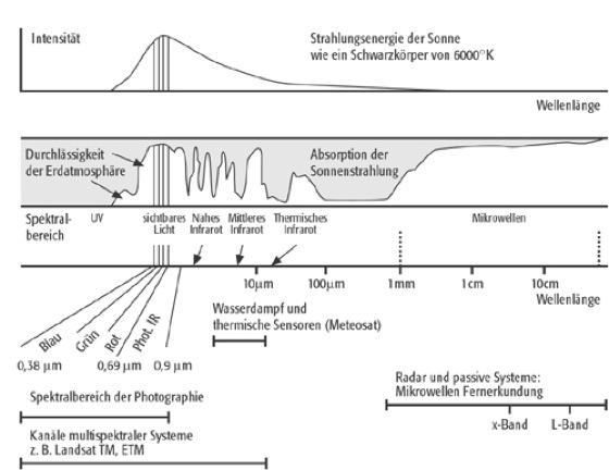 Spektralbereich, Ausschnitt aus dem Strahlungsspektrum. Multispektrale Scanner erfassen elektromagnetische Strahlung in verschiedenen Spektralbereichen, man spricht von einzelnen Spektralkanälen oder Spektralbändern (auch Kanäle oder Bänder). Für die geographische Fernerkundung bedeutend sind die Spektralbereiche des sichtbaren Lichtes, des Nahen Infrarot sowie des Mittleren Infrarot und gegebenenfalls jene des Thermischen Infrarot sowie der Mikrowellen-Radiometrie ( Abb. 1 ). Verschiedene Landoberflächen reflektieren je nach Spektralbereich unterschiedlich ( Abb. 2 , spektrale Signaturen), dies macht sich die Fernerkundung zu Nutze, indem die Kanäle gerade in den Spektralbereichen aufnehmen, in denen die größten relativen Unterschiede vorhanden sind. Die Abbildung 3 zeigt die 7 Spektralbereiche des ErdbeobachtungssatellitenLandsat TM und deren Anwendungsbereiche.